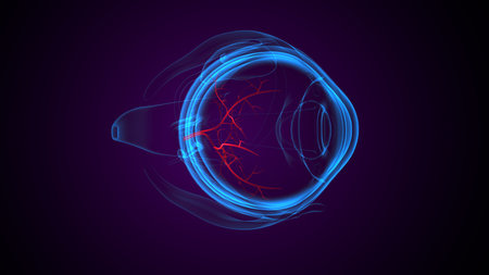 3D illustration of a human eye with a blue neon glow.