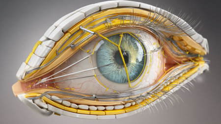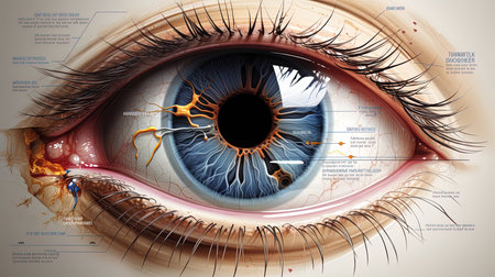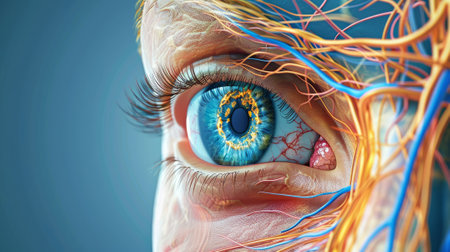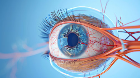 This image presents a detailed cross-section of a human eye, showcasing essential components like nerves, vessels, and eye structures designed for educational and medical use.