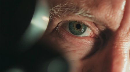 Close-up, Aging Eye Illuminated during an Examination in Doctor Visit with Senior Male Patient