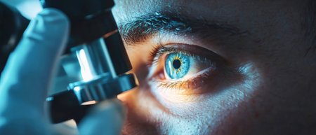 Close-Up Of Doctor Examining Patient s Eye With Bright Light During Eye Exam, Vision And Healthcare