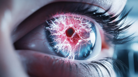 A detailed close-up of a human eye showing the intricate patterns of the iris and visible red veins. the image highlights the texture and structure, offering insights for medical studies and artistic projects. AI generation