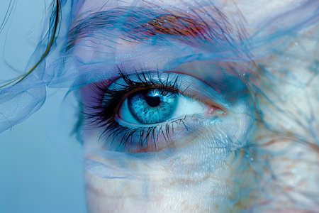 A close up of a womans eye with a mask on, resembling the intricately patterned scales of a reptile in electric blue hues, captured in stunning macro photography