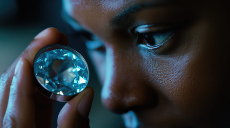 A person closely examines a large, faceted blue gemstone, showcasing their intense focus and appreciation for its clarity and brilliance. The image captures the intricate details and reflections of the gemstone, symbolizing beauty and luxury.