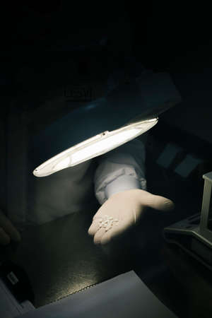 Hands of a scientist examining some white pills