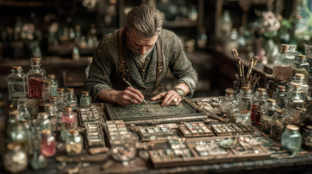 A skilled artisan meticulously creates an intricate design in a vintage workshop, surrounded by colorful jars and tools, capturing the essence of craftsmanship and dedication.