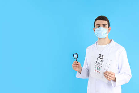 Eye doctor on blue background, healthcare concept