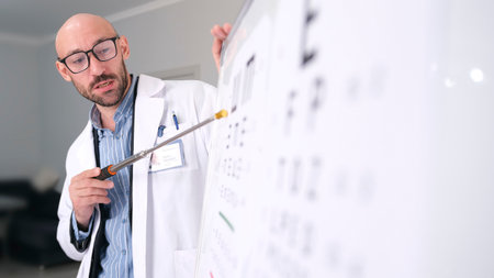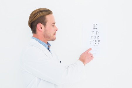 Optician in coat pointing eye test on white background