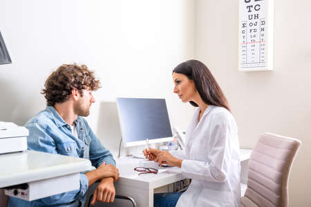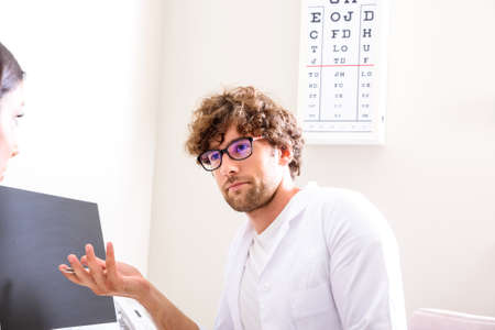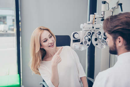 Optometrist consultation. Blond lady patient is asking brunet bearded male doctor optician about the equipment in his office