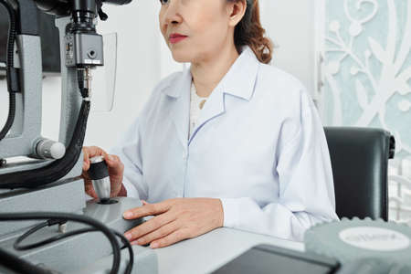Young professional ophthalmologist in whitecoat using new medical equipment