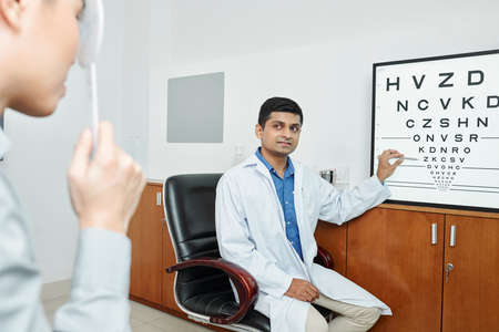 Indian man working as a optometrist he sitting and pointing at whiteboard with letters while patient saying them