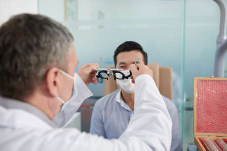 Doctor in medical mask asking patient to wear adjustable trial frame