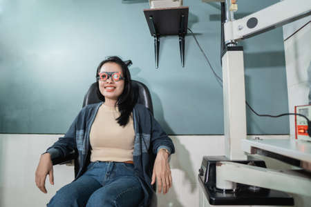 a beautiful woman is sitting in a chair and wearing an experimental eyeglass frame in an eye clinic for an eye check