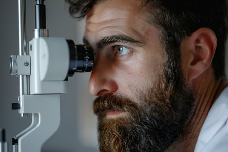 Bearded man undergoing an eye examination using specialized equipment