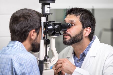 male doctor ophthalmologist is checking the eye vision of handsome young man in modern clinic. Doctor and patient in ophthalmology clinic.