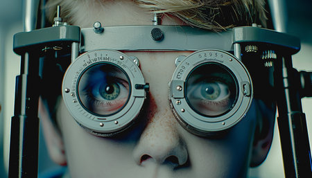 A male ophthalmologist checks a girl's eyesight using a phoropter. vision treatment.