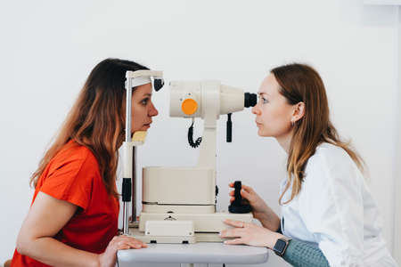 Young beautiful woman doctor/eye specialist/optometrist in an ophthalmologic clinic examines a patient with biomicroscopy with slit lamp procedure.