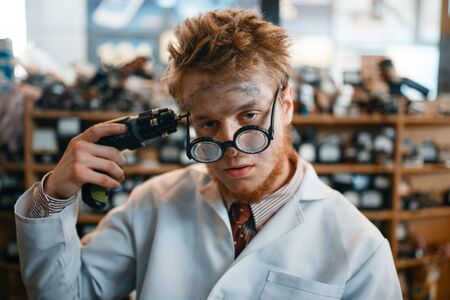 Strange scientist holds screwdriver at his temple