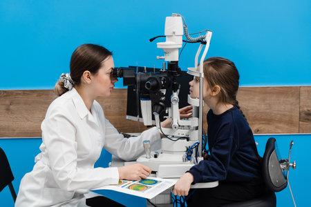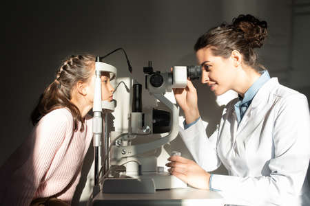 Pediatric ophthalmologist with slit lamp examines eyes and cornea of child. Ophthalmologist illuminates eye of child with light from slit lamp to diagnose the eyes and cornea