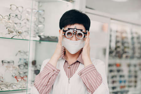 Portrait of an optometrist ophthalmologist middle aged woman wearing protective medical face mask