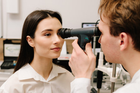 Optometrist examining eyesight of young woman patient in medical clinic.