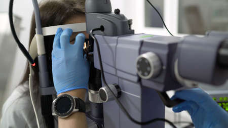 ophthalmologist doctor in exam optician laboratory with female patient. Eye care medical diagnostic. Eyelid treatment