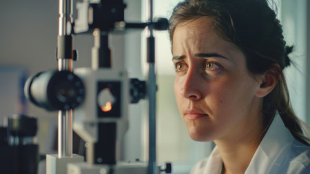 Close up portrait of a Caucasian female checking eyesight in an ophthalmologist clinic