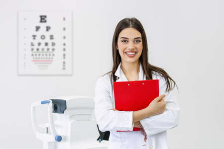 Beautiful woman optometrist with glasses posing in clinic