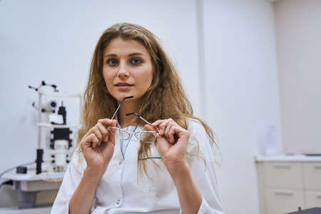 Charming female doctor in lab coat holding eyeglasses