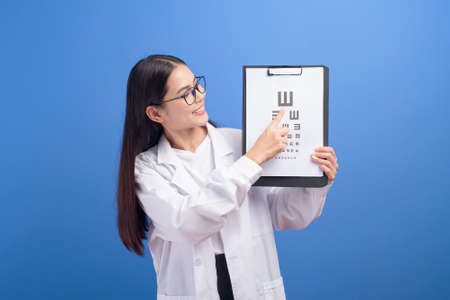 A young female ophthalmologist with glasses holding eye chart over blue background studio, healthcare concept