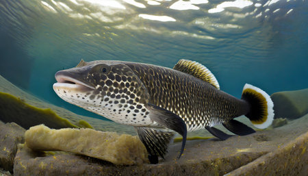 An African freshwater Mormyrus fish from the Mormyridae family swimming in clear water with aquatic plants and soft light, showcasing its elongated body and natural habitat.