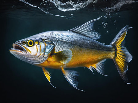 This image showcases a freshly caught fish prominently displayed against a bright yellow background. Ideal for culinary projects, marketing materials, and food blogs, it highlights the vibrant colors and textures of seafood. Perfect for chefs, nutritionists, and food enthusiasts.