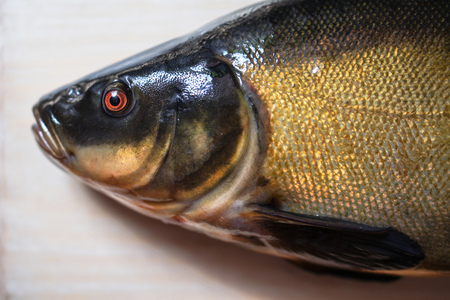 Coloring black lyn fish on a light board. Cooking food in a restaurant with fresh meat. Stock background, photo