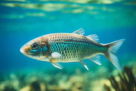 A vibrant fish glides gracefully through crystal-clear tropical waters, surrounded by coral reefs and marine vegetation. The colorful scales reflect sunlight, creating a stunning underwater display.
