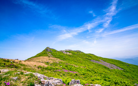Mountain landscape with green grass and flowers under blue sky with white clouds at Mudeungsang, Gwangju, South Korea.