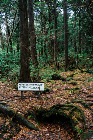 Dense, verdant Aokigahara Forest trails with mossy roots, rugged pathways.