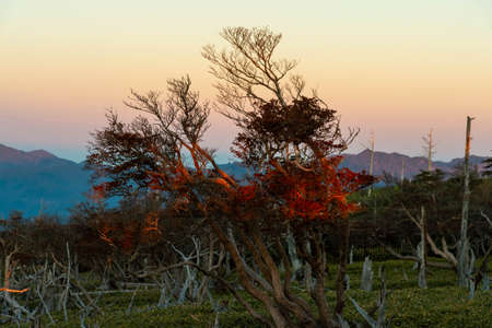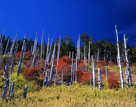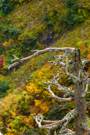 Autumn leaves in the forest with dead trees in the foreground. Jogakura, Hakkoda, Aomori, Japan