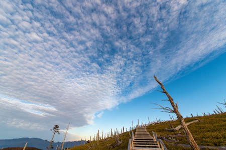 Wooden path on the mountain after the snow melts Japan Hyakunei Mountain Hachimandaira