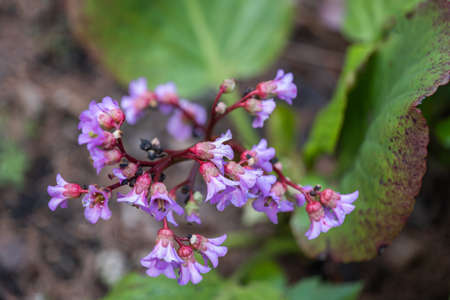 Bergenia Crassifolia Fritsch flowers, common names: heartleaf bergenia, leather bergenia, winter-blooming bergenia, elephant's ears, Siberian tea, Mongolian tea, family: Saxifragaceae, region: central Asia