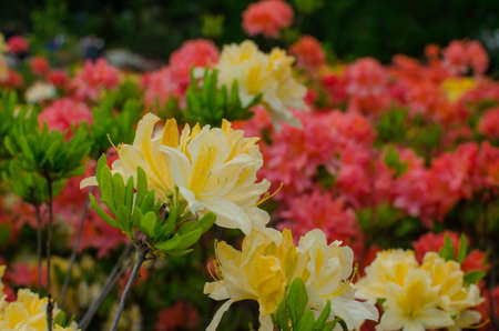 White and pink rhododendrons. Floral background with rhododendrons. Bush of delicate flowers of azalea or rhododendron plant in a sunny spring day.
