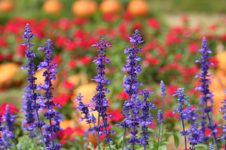 Selective soft focus on colourful field of flowers. Floral background of red, blue and pink flowers close up. Colourful floral pattern closeup.
