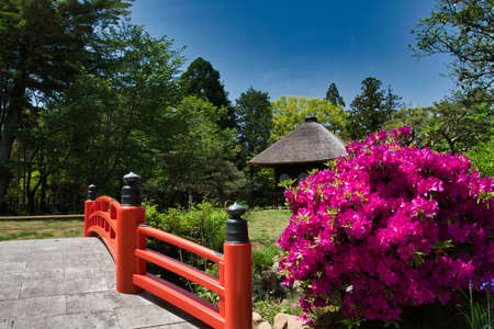 Red bridge and pink azalea flowers in the botanical garden