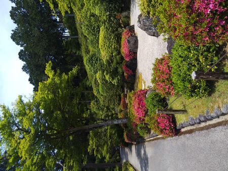 tokyo, japan - april 16 2020: Overview of the colorful garden dedicated to the topiary art of rhododendron flowers in the Shintoist Nezu shrine during the azalea festival or tsutsuji matsuri.