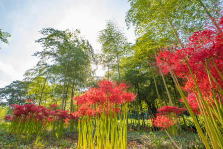 a garden in a forest full of Red spider lily in South Korea