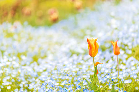 Beautiful nemophila and Turkish tulips blooming in spring fire mountain park (ballerina)