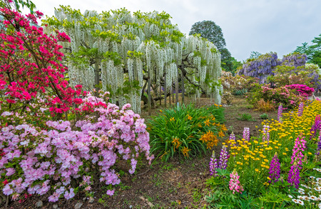 Hanging bunches of purple Wisteria and pink, red, white azalea bush. Spring time