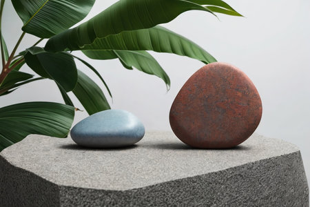 Podium for product presentation. Stone and tropical leaves background with empty space. AI generated.
