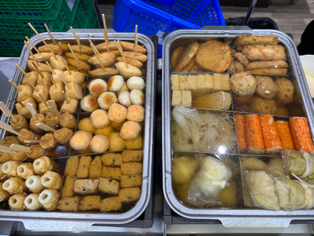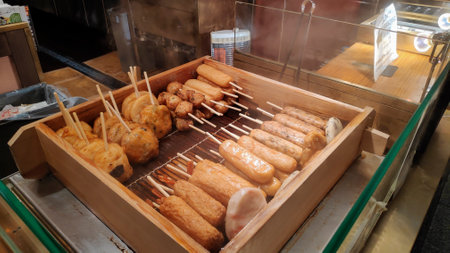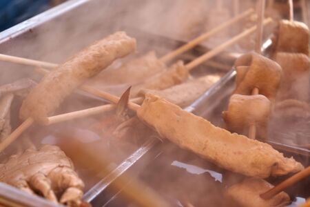 Kyoto, Japan- 26 Nov, 2019: Japan cuisine - oden food for sale in Nishiki Market, Kyoto. Typical Japanese winter dish with tofu, dumplings and daikon.