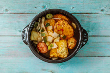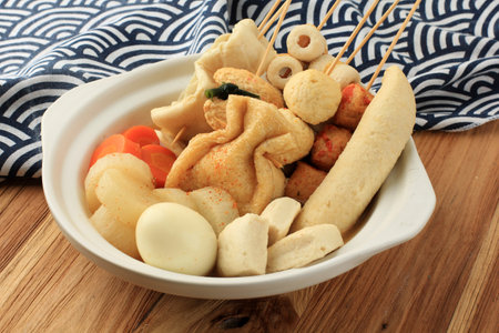 Oden with hot soup on wooden table, Japanese food.