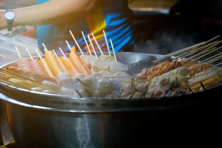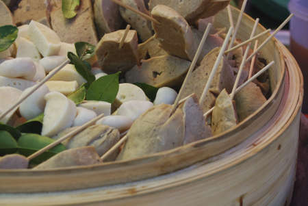 The steam seafood and meatballs with bamboo, wood stick. Traditional Street Food Thailand.
