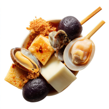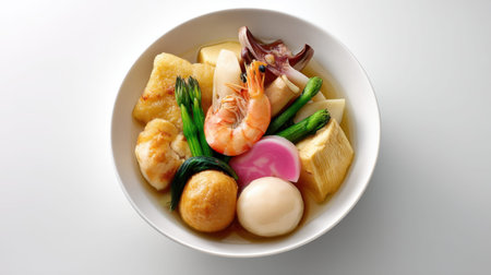 This high-quality image features an isolated oden dish filled with tofu, seafood, and delicious condiments, perfect for food-themed projects or culinary inspirations.